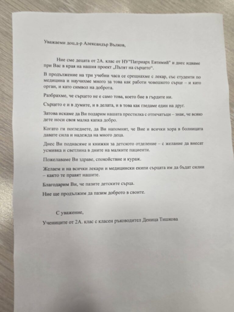 Идеята за посещението е на г-жа Тишкова и прераства в проект под името „Пътят на сърцето“, който малките ученици приемат с огромен ентусиазъм. В рамките на инициативата бяха дарени детски книжки, авторски коледни картички с пожелания за малките пациенти на Клиниката по педиатрия, както и красиви коледни украшения за елхата.